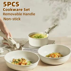 مجموعة من 5 قطع من أواني الجرانيت غير اللاصقة بمقبض قابل للإزالة
